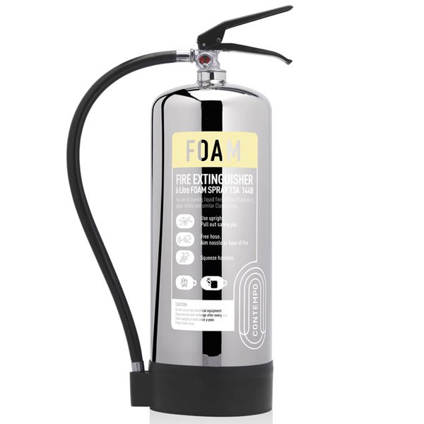 The chrome 6 litre foam fire extinguisher is actually made from non-corroding, highly polished stainless steel and perfect for both the designer look or for clean room environments. It also lasts for a lot longer than standard foam extinguishers.